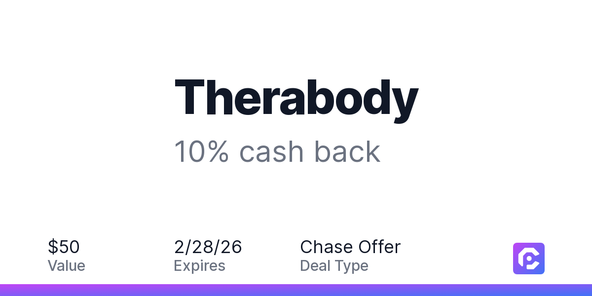 Earn 10% cash back on your Therabody purchase when you spend $99 or more including taxes and after any discounts, with a $50 cash back maximum.Therabody is the global leader in wellness technology, revolutionizing health and recovery to help everybody live longer, healthier lives. The company’s science-backed product ecosystem sits at the intersection of technology, healthcare and consumer goods, and serves three distinct categories: Wellness, Beauty and Performance. Science is the foundation of Therabody’s product development, with 25 scientific studies completed and over 75,000 articles supporting the efficacy of its treatments.Offer expires 2/28/2026. Offer valid one time only. Offer only valid on purchase made directly with the merchant. Offer valid online only. Offer not valid on purchase made using third-party services, delivery services, or a third-party payment account (e.g., buy now pay later). Offer only valid on U.S. purchase. It is possible that the merchant may split your purchase into multiple transactions. Offer redemption awarded as statement credit on the first qualifying transaction amount. Payment must be made on or before 2/28/2026.