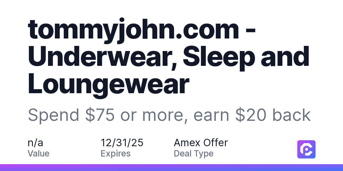 Eligibility and EnrollmentEnrollment is limited. Eligible Card Members must first add offer to Card and then use same Card for qualifying spend. Only US-issued American Express® Cards are eligible.Limit of 1 statement credit per eligible Card Member account. If the Card Account is canceled or past due, it may not qualify to receive the statement credit(s).Qualifying PurchasesOffer valid online only at US website tommyjohn.com. Excludes wholesale transactions. See merchant website for shipping policy. Some merchants may not ship to all areas. Offer valid only on purchases made in US dollars.Offer only valid on purchases made directly with the merchant. Offer not valid on purchases made using third parties, such as resellers, delivery services, or other intermediaries.Statement CreditPlease allow 90-days after 12/31/2025 for the statement credit(s) to be posted to the Account, provided that American Express receives information from the merchant about your qualifying purchase.Participation in Amex Offers is subject to Amex Offers Program Terms.POID: KB2L:0001