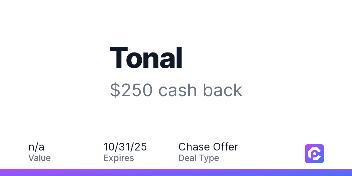 Earn $250 cash back on your Tonal purchase when you spend $1,000 or more, including taxes and after any discounts.Tonal is the ultimate strength training system, giving you the expertise of a personal trainer and a full gym in your home. Only Tonal can intuitively adjust weight based on your performance, help you maximize every rep efficiently—no wasted time or effort and track your progress to take the guesswork out of working out.Offer expires 10/31/2025. Offer valid one time only. Offer only valid on purchase made directly with the merchant. Offer valid online only. Offer not valid on purchase made using third-party services, delivery services, or a third-party payment account (e.g., buy now pay later). Offer only valid on U.S. purchase. It is possible that the merchant may split your purchase into multiple transactions. Offer redemption awarded as statement credit on the first qualifying transaction amount. Payment must be made on or before 10/31/2025.