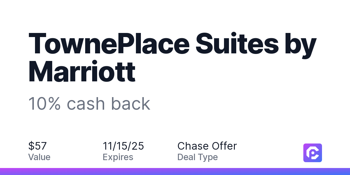 Earn 10% cash back on your TownePlace Suites by Marriott stay, with a $57.00 cash back maximum, when you spend $100 or more.