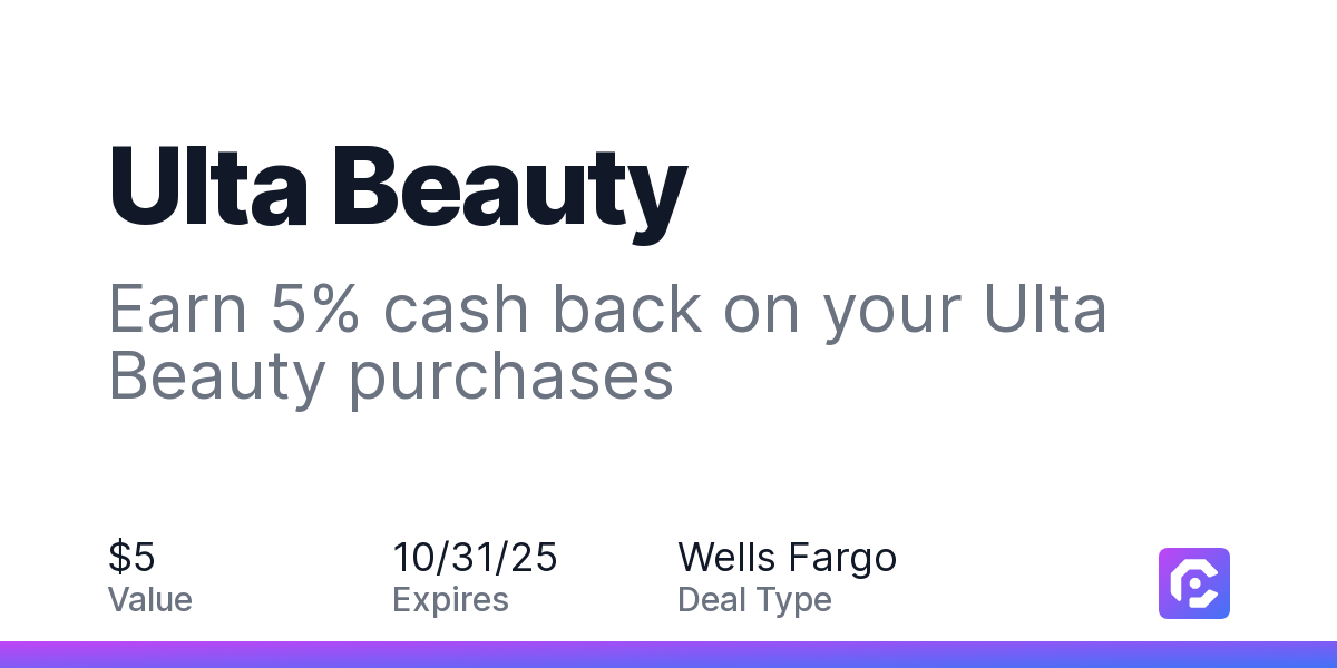 Earn 5% cash back on all of your Ulta Beauty purchases, until a $5.00 cash back maximum is reached. Offer valid online only. All Things Beauty, All in One Place®. Over 25,000 products. A mix of high and low. A range of shades and looks for all. Running the gamut of makeup, skin, hair, fragrance, and accessories. Find whatever it is that makes you shine. Shop Now Offer expires 10/31/2025. Offer valid online only at US website ulta.com. Not valid on orders shipped outside of the US. Payment must be made directly with the merchant. Offer not valid on purchases made using third-party services, delivery services, or a third-party payment account (e.g., buy now pay later). Payment must be made on or before offer expiration date.