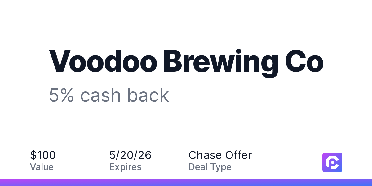 Earn 5% cash back on all of your Voodoo Brewing Co purchases, until a $100.00 cash back maximum is reached.