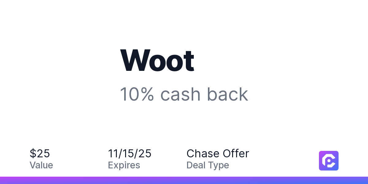 Earn 10% cash back on your Woot purchase, including taxes and after any discounts, with a $25 cash back maximum.Woot! is the original daily deals site, founded in 2004 and part of Amazon since 2010. We offer special daily deals and other limited-time discounts across seven categories, from Electronics and Computers to Home and Sporting Goods, and lots of random stuff in between Woot is also famous for its Box o’ Crap, a $10 mystery box of random things from our warehouse. You'll never know when they'll appear, or what you'll get!Offer expires 11/15/2025. Offer valid one time only. Offer only valid on purchase made directly with the merchant. Offer valid online only. Offer not valid on purchase made using third-party services, delivery services, or a third-party payment account (e.g., buy now pay later). Offer only valid on U.S. purchase. It is possible that the merchant may split your purchase into multiple transactions. Offer redemption awarded as statement credit on the first qualifying transaction amount. Payment must be made on or before 11/15/2025.
