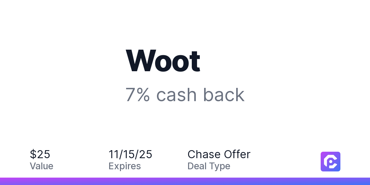 Earn 7% cash back on your Woot purchase when you spend $35 or more, including taxes and after any discounts, with a $25 cash back maximum.Woot! is the original daily deals site, founded in 2004 and part of Amazon since 2010. We offer special daily deals and other limited-time discounts across seven categories, from Electronics and Computers to Home and Sporting Goods, and lots of random stuff in between Woot is also famous for its Box o’ Crap, a $10 mystery box of random things from our warehouse. You'll never know when they'll appear, or what you'll get!Offer expires 11/15/2025. Offer valid one time only. Offer only valid on purchase made directly with the merchant. Offer valid online only. Offer not valid on purchase made using third-party services, delivery services, or a third-party payment account (e.g., buy now pay later). Offer only valid on U.S. purchase. It is possible that the merchant may split your purchase into multiple transactions. Offer redemption awarded as statement credit on the first qualifying transaction amount. Payment must be made on or before 11/15/2025.