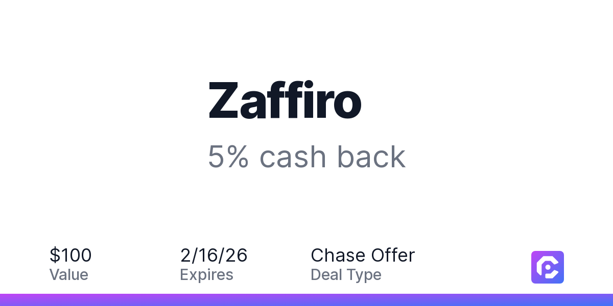 Earn 5% cash back on all of your Zaffiro purchases, until a $100.00 cash back maximum is reached.
